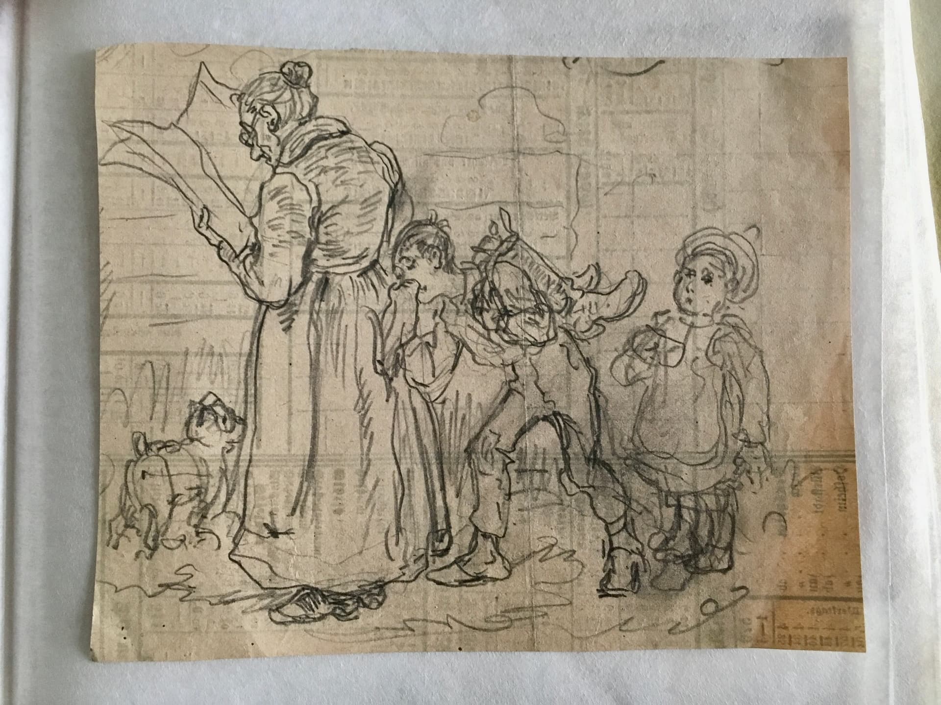 (Skizze des Zeichners Wilhelm Nestel, StadtA DA Best. 55 nestel/524 - Arcinsys | Detailseite: Stadtarchiv Darmstadt, Bestand 55, Genrestudie, Stiefeljunge putzt sich am Rock einer alten, Zeitung lesenden Frau heimlich die Nase, erstaunt beobachtet von einem kleinen Mädchen)